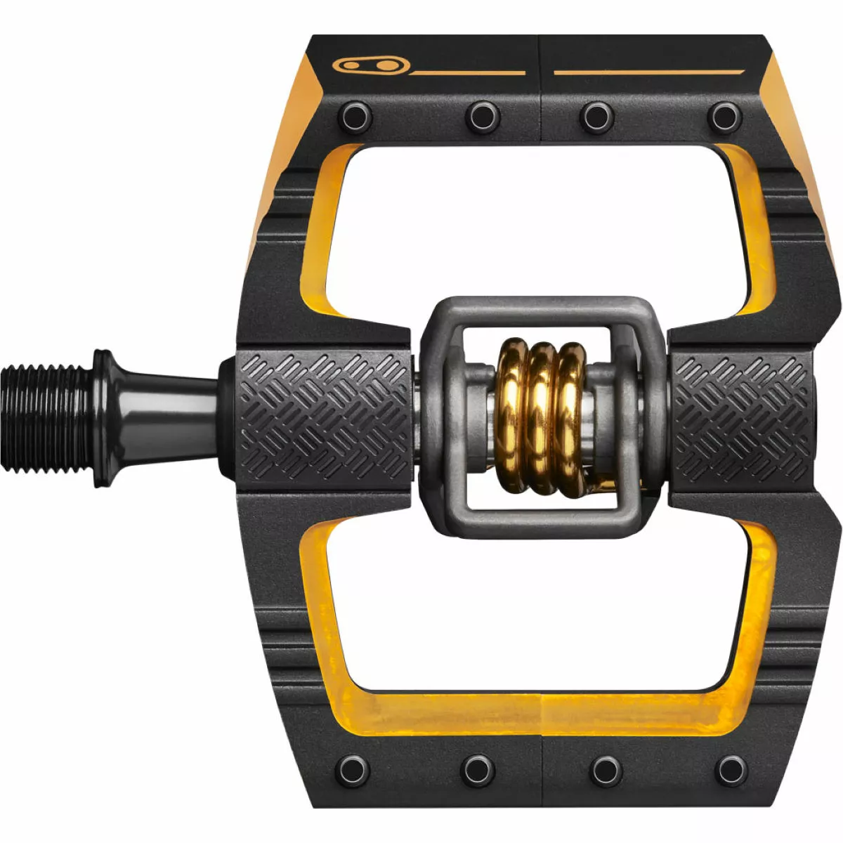 Spinning on a CrMo axle, a reliable and strong engagement to your cranks is assured, while the ribbed body section enhances traction for a better grip to your sole. Coming with brass cleats and shims, these hard-riding pedals come with eight optimally-placed pins, letting you ride with controlled aggression whether clipped in or not.Â