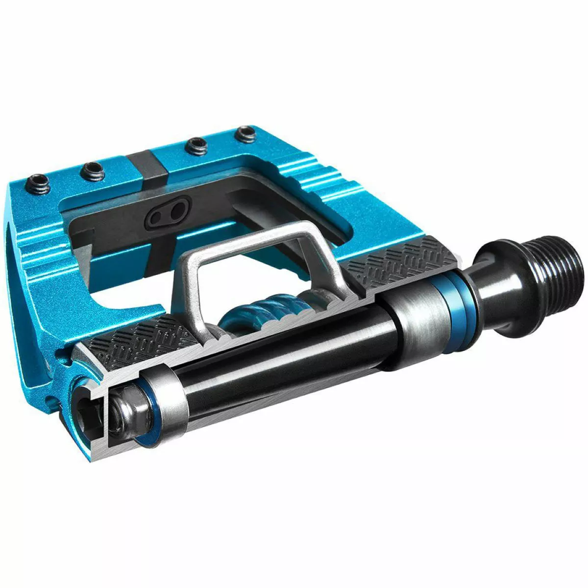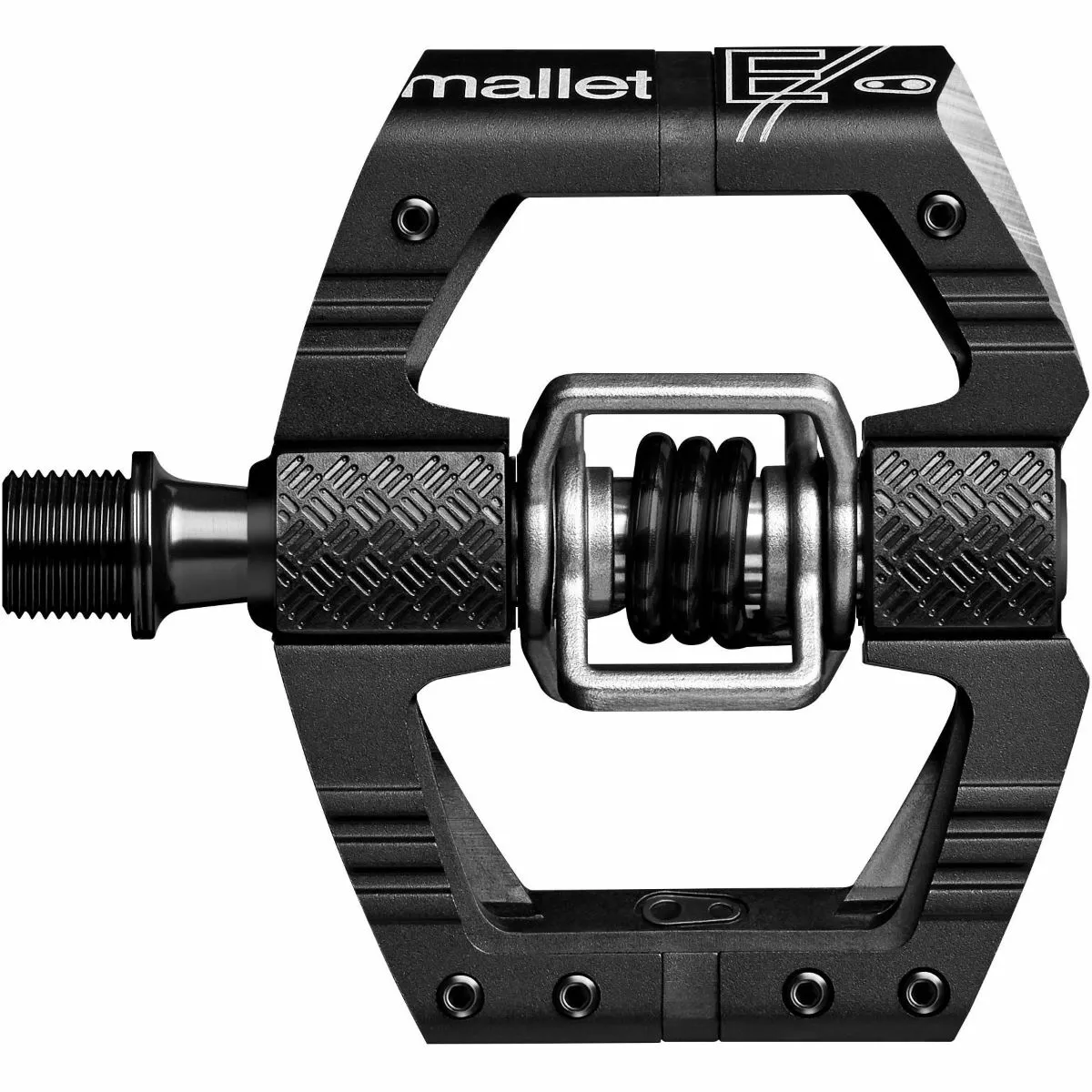 The concave pedal platform of this model offers a more secure foothold. Like its downhill (DH) equivalent, you get that flat pedal feel whilst running clipless. They’re 49g lighter and 12% smaller pedal body than the crankbrothers Mallet DH pedal with a 52mm Q-Factor compared to 57mm on the DH equivalent. Ribbed body allows for better traction when unclipped whilst chamfered edges allow a reduction in rock strikes. The open design of the crankbrothers Mallet E also provides excellent mud shedding. Plus, they also boast 4-sided entry, meaning you can clip in on all 4 sides of the pedal, by pushing forward or pulling backwards on the pedal.